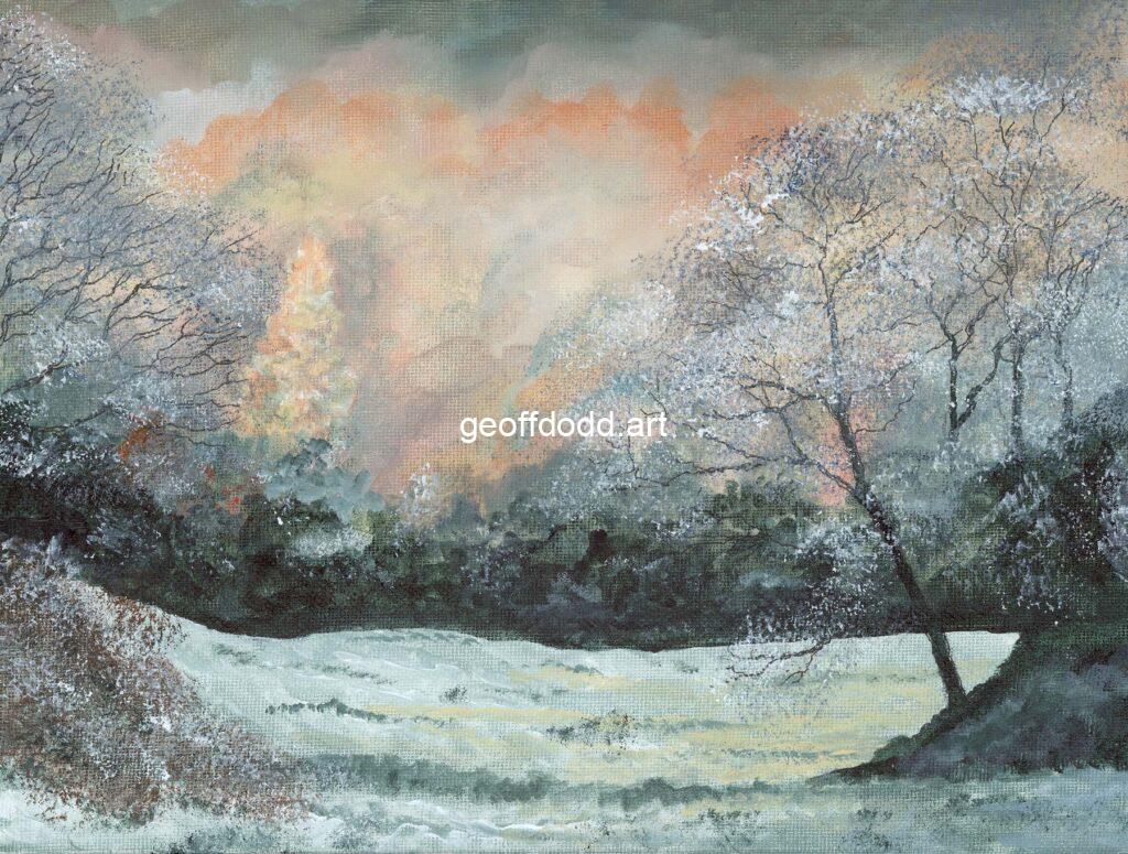 - “Deep and Crisp and Even” is a take from Good King Wenceslas, a crisp snow scene just in time for Christmas! This is my interpretation of a photograph taken by Steve Stain, a fabulous photographer who kindly gave his permission for me to use his “Autumn meets Winter” photograph as inspiration. I am very grateful to him. Look him up on the web, super work!
